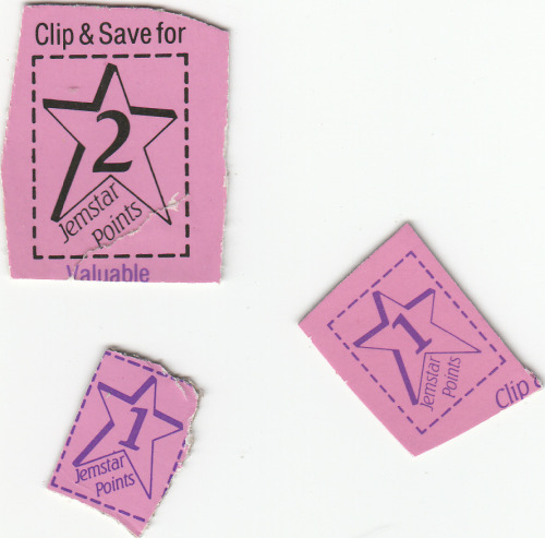 Here are a few more things that were in my bag of Jem and the Holograms Cutouts… It’s the instruction sheet from the original Jem Doll explaining how to transform Jem into Jerrica and vice versa. A little piece of sheet music with the theme song, and Jemstar Points…Those are what puzzles me the most. I can’t remember what or why I was saving those things, but there must have been some kind of offer. You’ve got to tell me if you can remember what it was you could trade them for.