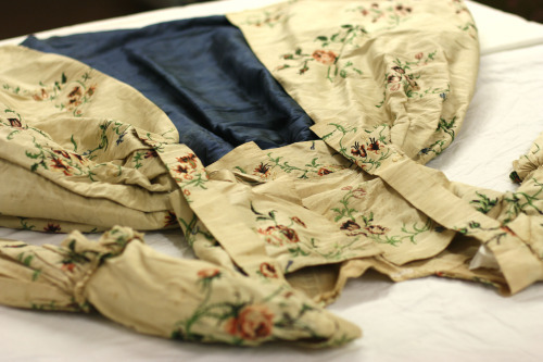 You could say I am over the moon about this overdress (HA! see what I did there?). I dont have too much information on this piece other than it is very clearly 18th century, and came from a family that had deep roots in the nearby Mohawk Valley. This overskirt has an underskirt in a lovely pink color. The silk is in amazing condition. I expected old silk to be very delicate, but this seems much sturdier than many of our late 19th/ early 20th century pieces. I assume this has something to do with how the silks were treated as chemical processes and dyes changed.