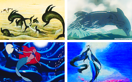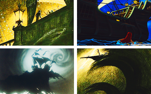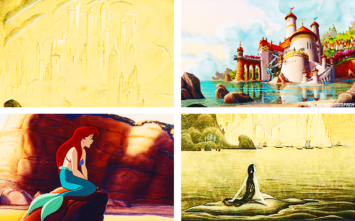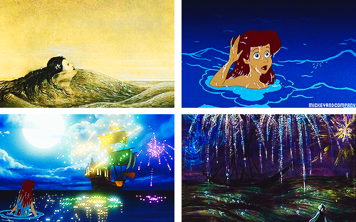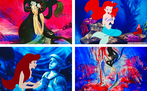 Concept art for Walt Disney’s cancelled adaptation of The Little Mermaid, by Kay Nielsen, (1941) and footage from Disney’s The Little Mermaid (1989)