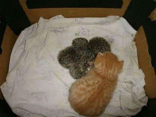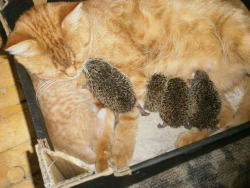 Mama ginger kitty adopts four orphaned baby hedgehogs after their mother dies, and raises them alongside her own kitten.