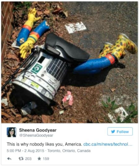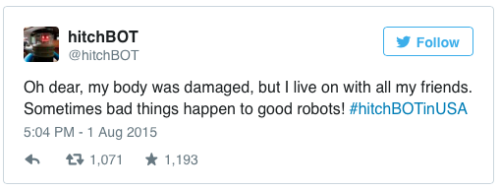 Canada sent a friendly robot to America. Americans destroyed it.This is why we can’t have nice things. On Saturday, vandals in Philadelphia destroyed a hitchhiking robot from Canada named HitchBot, two weeks into its U.S. trip. Designed as a social experiment, HitchBot could talk to humans and upload photos to social media. If you found it, HitchBot would tell you where it wanted to go and ask for a ride. Worry not though, HitchBot may get a happy ending.