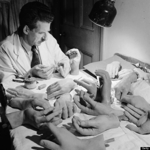 historicaltimes:A technician works on broken hands from the...