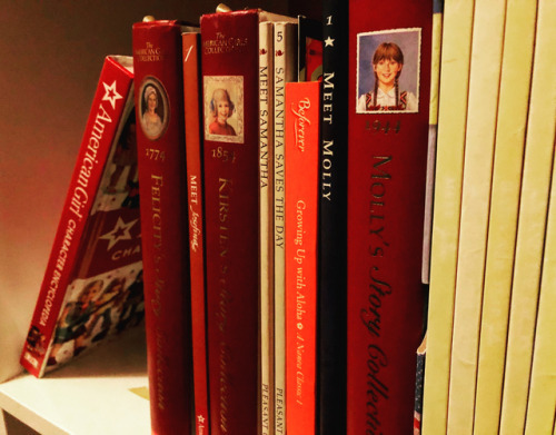 My Pleasant Company/American Girl shelf represents a lifetime of collecting. Sure, I wish I’d kept all the parchment paperbacks I amassed in my childhood (my sister got them when I “grew up”), but the gist of it is there. My biggest gripe about the company in the present is that they removed the illustrations from the stories. Yes, I loved the characters and still do, but those pictures made the series special.