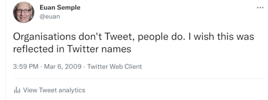 As I teeter on the brink of deleting my Twitter account I thought I would look for the original tweet where I said “Corporations don’t tweet – people do”. The earliest instance I can find is 2009 but I don’t think that is the original as I had already changed it to Organisations Don’t Tweet, People Do (the of course bloody Wiley Americanised it for the book).