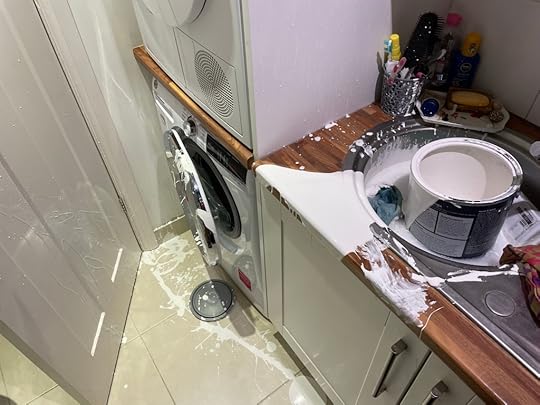 Today when I opened one of the cupboards a large paint tin dropped, hit the edge of the sink, burst open, sprayed paint all over our new washing machine, the walls, the door, the floor and me. Lots of it. It also filled the sink with paint which immediately blocked.