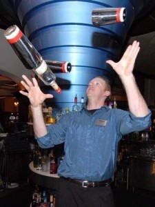 He set out three martini glasses and pulled an opened bottle of vodka from its spot behind the bar. Palming the bottle, he tossed it up an inch or two and caught it. Before Alex could stop him, the bottle flew in the air, spun in an arc and landed perfectly in the spiky hair’s hand. The women whooped in whistled as he grabbed a metal martini shaker and juggled the bottle and shaker in one hand.