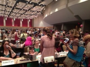 The conference always kicks off with the “Readers for Life” Literacy Autographing event on Thursday night. This was my first book signing and it was a blast. Authors are arranged in alphabetical order and I ended up across from popular YA author, Ally Carter. She had a steady stream of very excited preteen girls. It was sweet and fun to watch, however, those of us with more *clears throat* adult books were shielding covers. Friendly suggestion to RWA: think about a YA signing section next year!