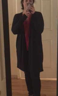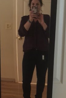 Sorry, the lighting is not the best! So, what did I love? I really love the two dresses and I'm keeping the one in the last picture. It's the perfect piece to bring with me on my business trips next month. I love the first dress too, but it was too short and tight (hello, boobs) for work and I'm not sure where I'd wear it. I also love the blouse in the second picture. It's a black/purple print with a cute fringe detail down the front. It's great for work with black pants or skirt and can also be worn with jeans for a more casual look. The cardigan in the third picture felt beautiful on but it was the priciest item in the box and I couldn't justify the cost with how much I'd actually wear it. Now to the jeans...oh, the jeans...they felt beautiful on but they were REALLY skinny and even though they were ultra comfortable to wear, I didn't feel comfortable in them. I would love a pair in straight leg or even boot cut.