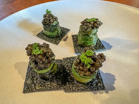 Amuse of caviar and nori.