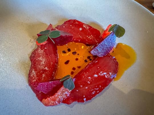 big eye tuna, beets, blood orange, lanzhou chili. Sweet and tangy.
