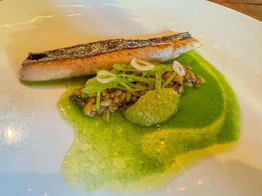 grilled mackerel, snap peas, green farro, black bean, pistachio.