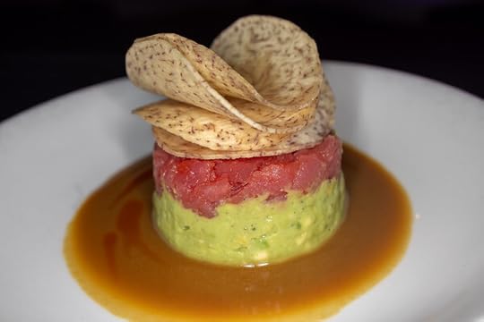 Tuna Tartare. hass avocado – taro chips – soy-honey emulsion.