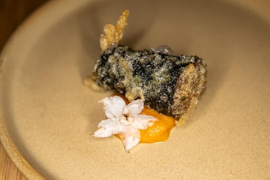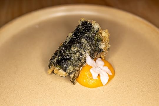 Amuse of crispy seaweed wrapped rice cake. Interesting chew, but a touch bland.