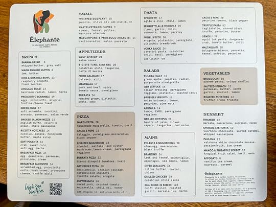 The menu. Elephante has pretty tasty food for a “trendy view / scene” place. It was surprisingl...