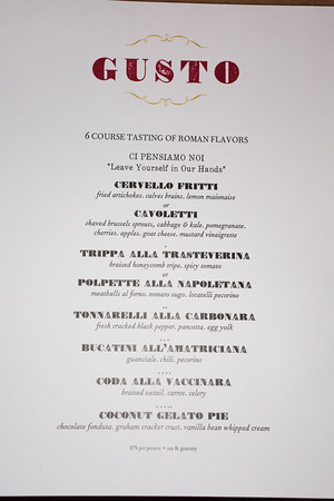 Our menu. I had been under the impression he was slanting more Ancient Roman, like this crazy meal at the Getty Villa, but...