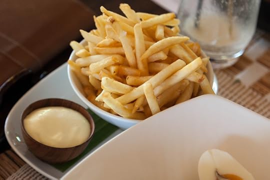 Here in paradise the view from the lunch table doesn’t suck. One could eat outside there too, but it was pretty hot, like 94 degrees and humid. The food, however, was anything but tepid. It’s highly varied and international with an Indian slant fitting the location.