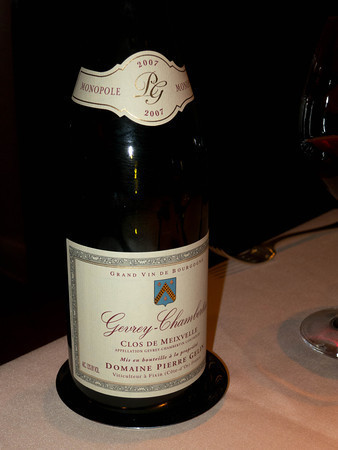 "Pierre Gelin, Gevrey-Chambertin "Clos de Meixvelle" 2007." This turned out to be an excellent example of young Burgundy. Bright notes of berries I soft round charm.