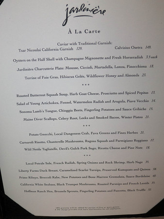We left the reservation aspect of our San Francisco trip to a bit late. S.F. diners, it seems, make their reservations early. Besides, we were traveling with my 3-year-old, so long involved tasting menus were not an option. Sigh. Coi even had availability. In any case, we ended up at this overpriced but tasty California French. Although not pictured, the dining room is lovely in one of those ornate between the wars styles.