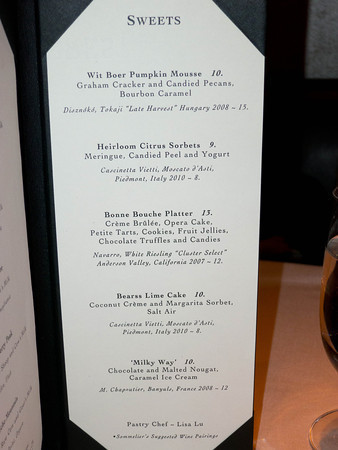 "Bearss Lime Cake. Coconut Crème, Margarita Sorbet and Salt Air." Basically deconstructed piña colada.