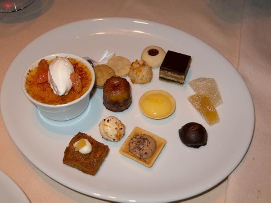 "Bonne Bouche Platter. Crème Brûlée, Opera Cake, Petite Tarts, Cookies, Fruit Jellies, Chocolate Truffles and Candies." A bit of everything — and in a good way.