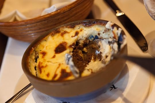 "Moussaka – traditional casserole of spiced lamb, eggplant, potato & yogurt béchamel." I love this traditional dish.