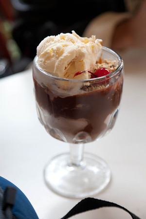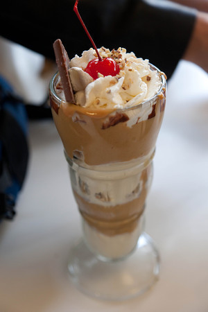 I went for this peanut butter sundae. Vanilla ice cream, peanut butter sauce, chocolate sauce, chocolate peanut butter square. It was darn good, although not as decadent as the bacon sundae.