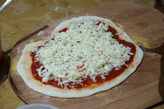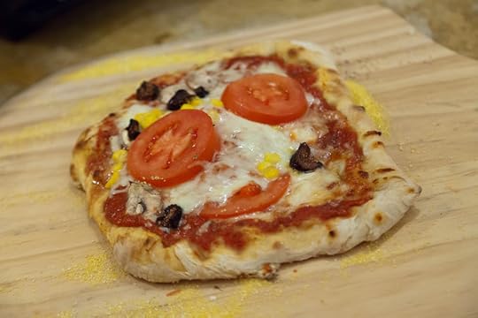 Well, we've pretty much got our whole pizza thing down to a science, but still, each time you learn something. I'm still working on the mechanics of transfer into the hot over. If a pizza makes it into the oven without spilling anything then it always cooks perfectly. Get it out — provided you lube up the pizza stones with corn meal — is easy. But I made progress. By making sure to put the pizza's on the end of the peel, to lube well, and using a new pizza sized teflon spatula I was able to keep things pretty much under control.