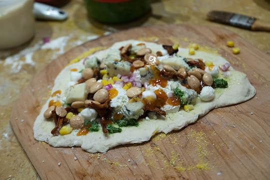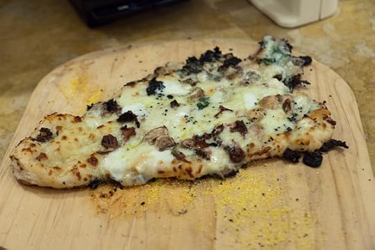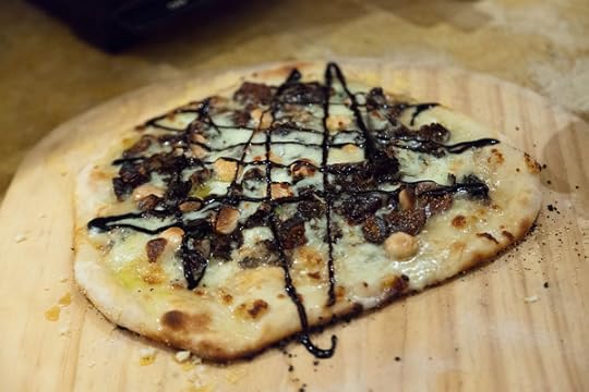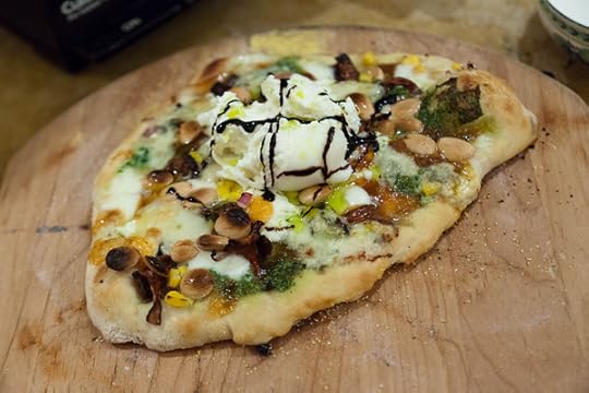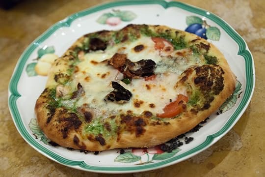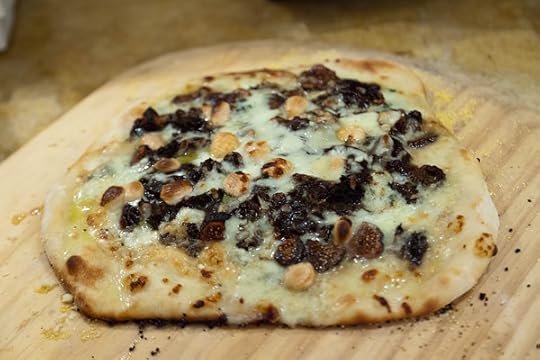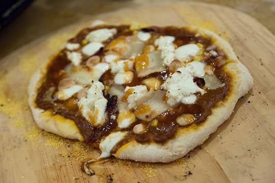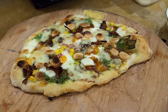 As a final pizza I made a new variant. This puppy has truffle oil, pesto, dabs of curry, corn, about five types of cheese (mozz, parm, blue, mozz balls, pecorino), figs, chanterelle mushrooms, onions, and even mango chutney.