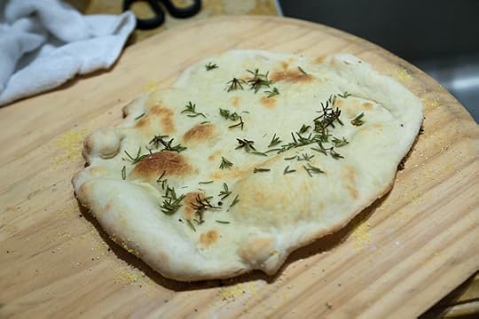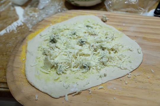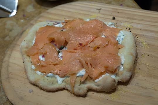 Then my patented (albeit stolen from Wolfgang Puck) bagels and cream cheese pizza. First I brush the dough with white truffle oil and fresh rosemary from the garden, then bake.