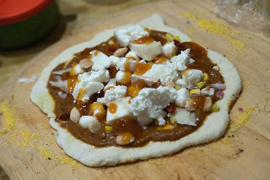 Now up is my personal favorite, the chickenless tikka masala pizza. With fresh masala sauce as the sauce. Then bucheron goat cheese, parmesan, almonds, corn, fresh ricotta, mozz balls, and red onion. Then as a new touch this time, I added spicy mango chutney.
