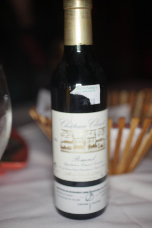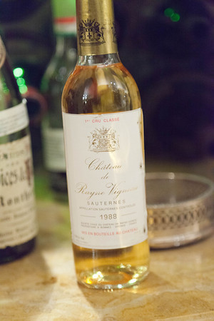 For dessert out comes the 1988 Rayne-Vigneau. Parker 91. "The 1988 is the best example I have tasted from this property. An intense, honeyed, pear, flower, and apricot fragrance is reminiscent of Muscat de Beaumes de Venise. In the mouth, there is exceptional richness, super focus because of fine acidity, a wonderful touch of toasty new oak, and an elegant, very positive, crisp finish. This is a beautifully made, authoritative tasting, and impeccably well-balanced Sauternes. Anticipated maturity: Now-2006. Last tasted, 3/90."