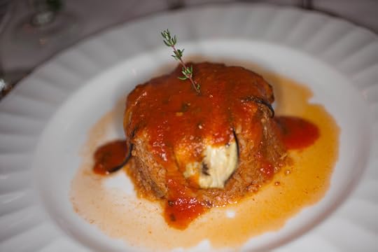 For the main. "Maqloupah. Layers of Roasted Eggplant, Ground Lamb and Rice served with Fresh Cucumber and Yogurt Sauce." This had a very nice middle eastern flavor. The eggplant, lamb, and tomato thing with yogurt was something I had a lot in Turkey. The execution was spot on.