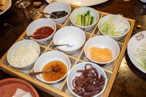 Ultimate Condiment Box. Tons of interesting things to put in the duck pancake, including sweet and spicy sauces, sugar, candied fruits, melon, etc.