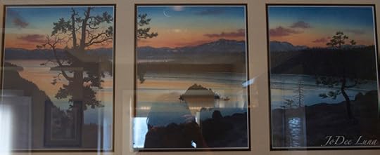 I looked up and noticed that what I thought was a photograph was actually a watercolor painting. I'd admired this framed piece on the wall of the condo where we're staying in Heavenly Valley, Tahoe. It resembled what my husband and I wanted to put on the wall of our family room, a photo from Lake Tahoe that is divided into three parts. Yet even though I've admired this piece for several days, I never noticed that it was a watercolor painting entitled "The Triptych." I looked closely to see that the artist was Bill Jewell.