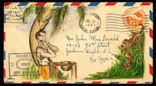 The National Postal Museum has a current exhibit on illustrated mail that includes several examples of Jack Fogarty's letters sent from 1944-45. Fogarty served with the Army's 98th Evacuation Hospital in the Pacific and became lifelong friends with a fellow soldier, James MacDonald, and his wife Mary who was home in Queens, NY. Fogarty sent letters to Mary with envelopes showing scenes of life at the camp. In Smithsonian Magazine, Fogarty describes the letters as "an expression of love for the MacDonalds." Jack Fogarty is now 92 and lives in New Jersey. Both the MacDonalds have passed away but their daughter donated 33 illustrated envelopes to the museum. Check them out if you get a chance; really wonderful stuff.