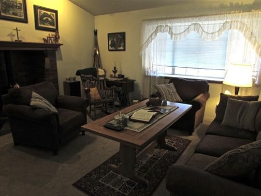 How are you doing? I wish we could sit in my cozy real-life living room and have a nice chat. The decor is not at all Victorian, as you can see, but the couch and chairs are comfy.