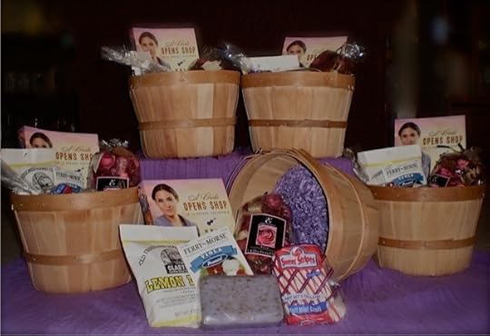 The story-related items, as seen above, are: an autographed copy of A Bride Opens Shop in El Dorado, California, a French-milled lavender soap bar, a bag of lemon drops, a bag of peppermint sticks, a bag of rose potpourri, and a package of violet seeds. The winner gets the bushel, too.