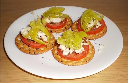 That night, he used items we had on hand to create this tasty treat: Milton’s Everything crackers, tomato slices, feta cheese, basil, and pepperoncini slices.
