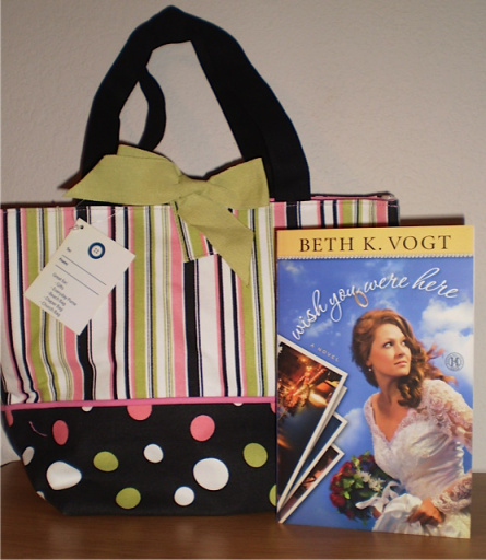 I’m giving away a tote bag just the right size for a soda, some snacks, and a book. The winner will also get a copy of Wish You Were Here, a contemporary romance by Beth Vogt.