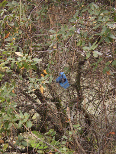 The brilliant blue "bird" was not a bird at all. What I'd seen from a distance was a plastic bag that a pet owner had filled after a dog had done its deed and had flung into the trees.