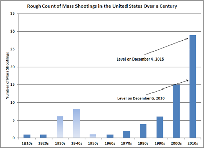 Herewith I show a version of that chart updated to include the San Bernardino shootings of this month. My source for the update is here . Today, halfway through the 2010s decade, we are showing 27 such shootings (versus 15 in the whole 2000s decade). Since last publishing this chart, when the 2010s total stood at 16 events, 13 more mass shootings have been added.