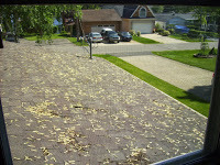 ). At our new house we have two maples in quite close proximity, growing on the edges of our neighbor’s lawn. One is a rather stately Silver Maple; its branches shadow parts of our roof from on high, and I mean very high. In the image I show, the maple seeds covering our roof are from this oldster. Next to it, separated by a rather rich spread of lilac bushes, is a Red Maple shading our garage. It is small, with smooth bark (indicating youth) and, at this season, very green leaves. If you are persnickety about concrete, and want it pristine, do not associate with maple trees that shade it. All year long they continuously rain down something: not only seed but of leaves, twigs, and branches too. But sweeping them up at right regular intervals provides a benefit: a feeling of accomplishment on the cheap. It all looks so neat—and tomorrow it’ll need the broom again…