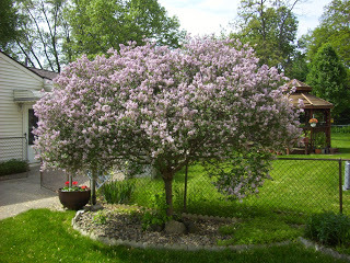 Sunday last we saw our favorite butterfly for the first time, the Black Swallowtail, feeding in all leisure off the blooms of a rather curious tree of ours. It is a Dwarf Lilac known to the botanists as Syringa meyeri ‘Palibin’. I call it a curious tree because it is actually a combined form of a tree below and a bush above accomplished by grafting. The Korean Dwarf Lilac ordinarily has a very short stem of no more than 5 inches, so that the lilac hugs the ground. But look at these pictures: