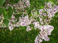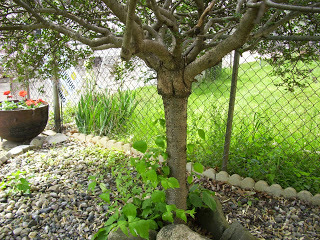 The trunk of this “tree” measures 3.5 feet from the ground to the point where the branches articulate—thus way taller than the Korean Dwarf Lilac’s natural height. Our tree, therefore, is what they call a topgraft. The top part is a Dwarf Lilac and is called the scion; the trunk must be from a genetically related plant that grows quite high; it is called the interstem. With dwarf lilacs the two interstems normally used are Syringa villosa or the Japanese Lilac (Syringa reticulata). Our interstem is definitely a Villosa, commonly known as Lilac, Late; note, on the picture above, the green branches growing at the stem’s bottom; those leaves are the original leaves of the stem and helped me identify it. The Dwarf Lilac’s leaves are much smaller, darker in color, and of a different shape. But let me emphasize, again, that both the trunk and the top belong to the same genus; genetic similarity is a must for successful topgrafting.