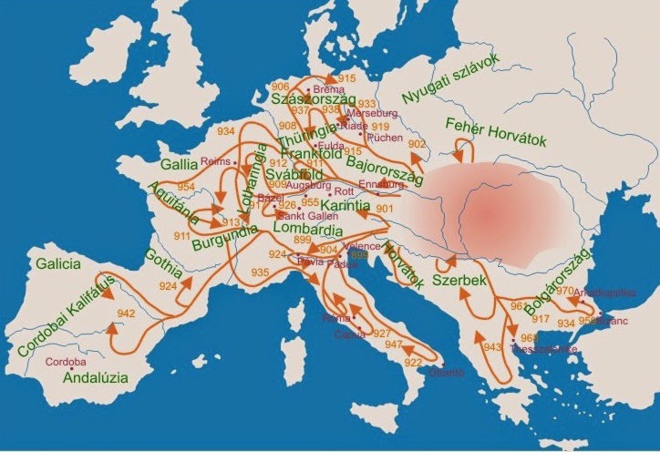 From that time forward, the Magyars, behaving in accustomed nomadic/Hunnish style, launched numerous raids into Europe to acquire loot and slaves. They reached as far north as Denmark (915), as far West as Aquitaine in France (913, 934, 954), as far southwest as Spain (942), as far South as Italy (922, 947), and in all of these cases making their way through the German states. These forays were always both brief and not terribly destructive. They came to an end, finally, when Otto I—he who re-founded the Holy Roman Empire—defeated them decisively in the battle of Lechfeld (near Augsburg in Bavaria) in 955. Thereafter the Hungarians settled down—their own territories still intact, and began a process of aligning themselves to the European system by diplomacy and the acceptance of a feudal culture.