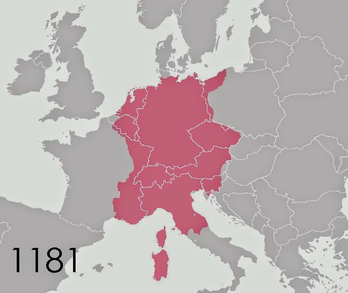 The solid black lines above indicate the extent of Otto’s realm in 972, thus ten years after his coronation. The HRE still controls significant elements of France. The following series of maps next shows the evolution of the HRE over time, the marked areas shown overlapping modern boundaries.