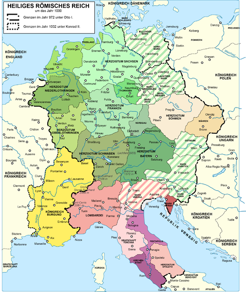 To illustrate this. The Carolingian was a genuine empire only while Charles I ruled it. Thereafter it fell apart physically. And the realm that came into being with the election of Otto I might be labeled the United States of Germany. Otto controlled some but not all German duchies—and, at his elevation, became King of Italy. The Emperor’s powers were always quite limited; the states that made up the later HRE had quite real sovereignty of their own—much more so than the states of the USA. But the Emperor had moral suasion, so long as he was firmly on the job, which was not always the case. After 911 the Office itself became elective, the electors being kings and dukes.