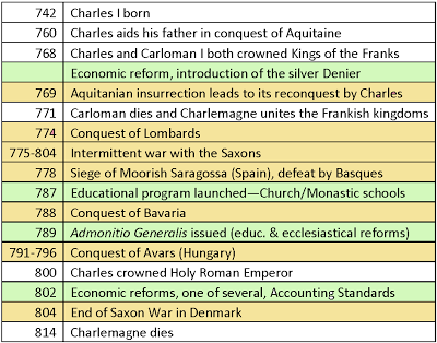 Now some notes to the Timeline. Carloman I was Charlemagne’s younger brother. Upon Pepin’s death, in conformity with Frankish custom, Francia was split between Charles and Carloman. This custom caused consolidated realms to fall apart, alas. The Carolingian empire held together until 840, outlasting Charles’ own death by 27 years, only because, at his death, Charles only had one surviving son, Louis the Pious. After Louis’ death the Holy Roman Empire fell apart—to be reconstituted, but now with a Germanic focus, by Otto I who was himself a direct descendant of Charlemagne.