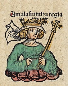 Amalasuntha was a Goth, the daughter of that people’s most formidable emperor, Theodoric the Great. She illustrates the role of women—then and also now (thinking now of Indira Gandhi) who carried on a famed tradition. She ruled the Ostrogothic kingdom (Italy, parts of France, parts of the Balkans). Her orientation was strongly Roman rather than Christian. Like many ruler she was eventually deposed and murdered in her bath, Had she been Christian, she’d surely now be a saint as well.