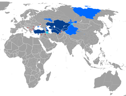 Let me first summarize this history as broadly as possible. In the period just before and a little after the Middle Ages, several major nomadic invasions of Western Europe took place mostly by Turkic-speaking peoples who had originated, or came directly from Mongolia moving to the west. These were Huns, Avars, Magyars, the Mongols of Genghis Khan, and finally the Osmanli, another Turkic group, whose name, mangled by the westerners, gave us the Ottomans. Of these only the majority of the Magyars, roughly seven of ten tribes, spoke Ugric rather than Turkic; the other three joined with them were of Turkic origin.The map shows the prevalence today of the Turkic language. Most of the invasions we’re talking about were from the blue regions in the center of the map, usually to the West but rarely ever managing to get much past Hungary and the Balkans. To be sure, invading salients did, temporarily, penetrate deeper, but they were rarely more than extensive raids.